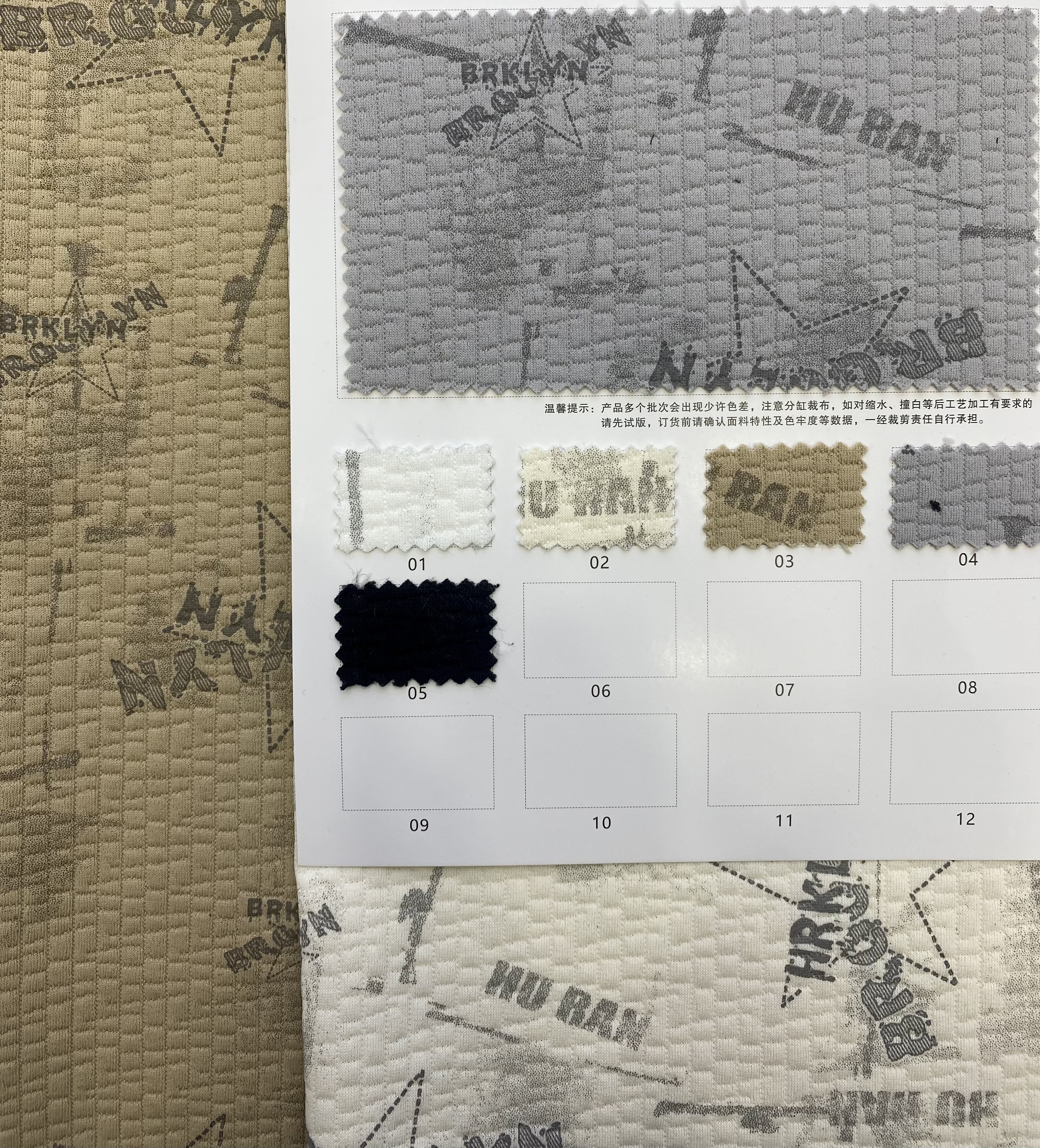 One of the key advantages of this fabric lies in its multi-layered nature: the jacquard fabric base gives structural texture and premium feel; the print ink & wash with letters treatment adds graphic sophistication and brand positioning; and the breathable fabric foundation ensures wearer comfort and season-appropriate performance. For clothing fabric buyers and brands, this integration means fewer compromises—design, feel and function are bundled into one wholesale fabric. Moreover, because the texture is woven and the print is applied on a robust base, issues like fading, peeling or poor hand-feel are reduced compared to lesser fabrics. This makes the material a strong choice for fashion lines where both appearance and garment performance matter.